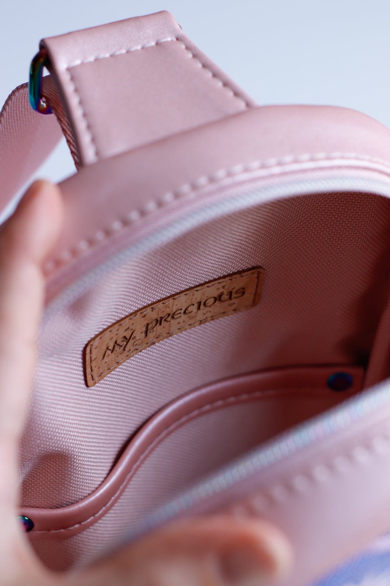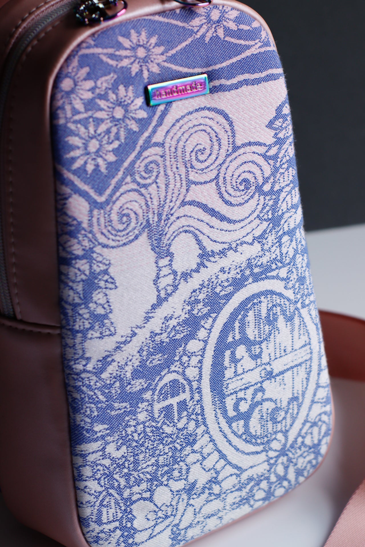 This minimalist-style sling features a wide, ambidextrous, approximately 50" adjustable strap. The exterior showcases officially licensed Middle-earth fabric from Oscha Slings, paired with shimmery, smooth, luscious pink faux leather. Rainbow hardware is used throughout, including limited-run themed zipper pulls. Inside, you’ll find a single slip pocket large enough to accommodate all phone types, along with a fun themed tag - a Knotted Threads Co. exclusive design.