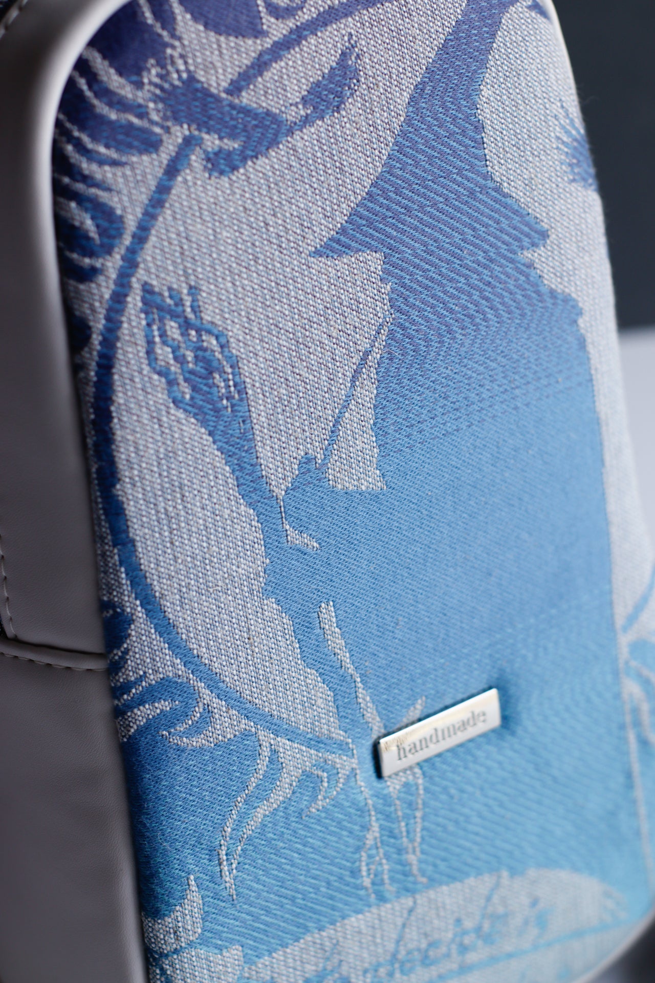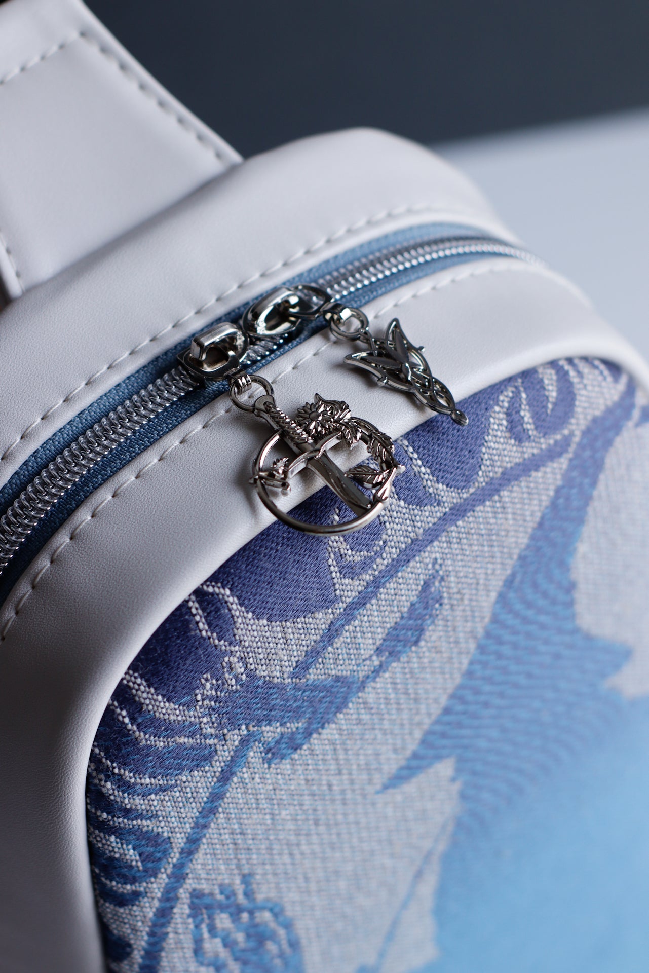 This minimalist-style sling features a wide, ambidextrous, approximately 50" adjustable strap. The exterior showcases officially licensed Middle-earth fabric from Oscha Slings, paired with soft, subtle cloud-grey/cool-toned off-white faux leather. Nickel hardware is used throughout, including limited-run themed zipper pulls. Inside, you’ll find a single slip pocket large enough to accommodate all phone types, along with a fun themed woven tag.