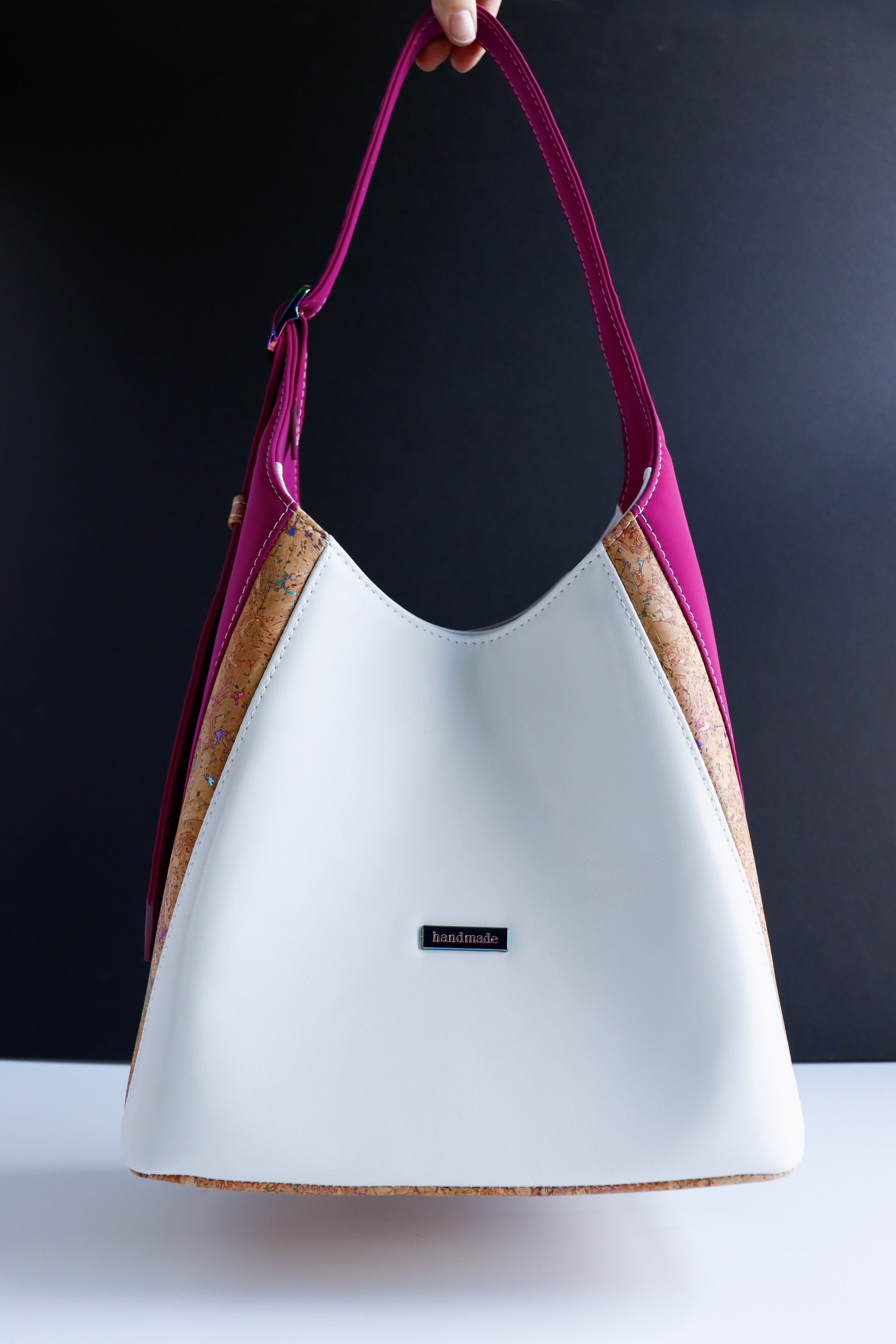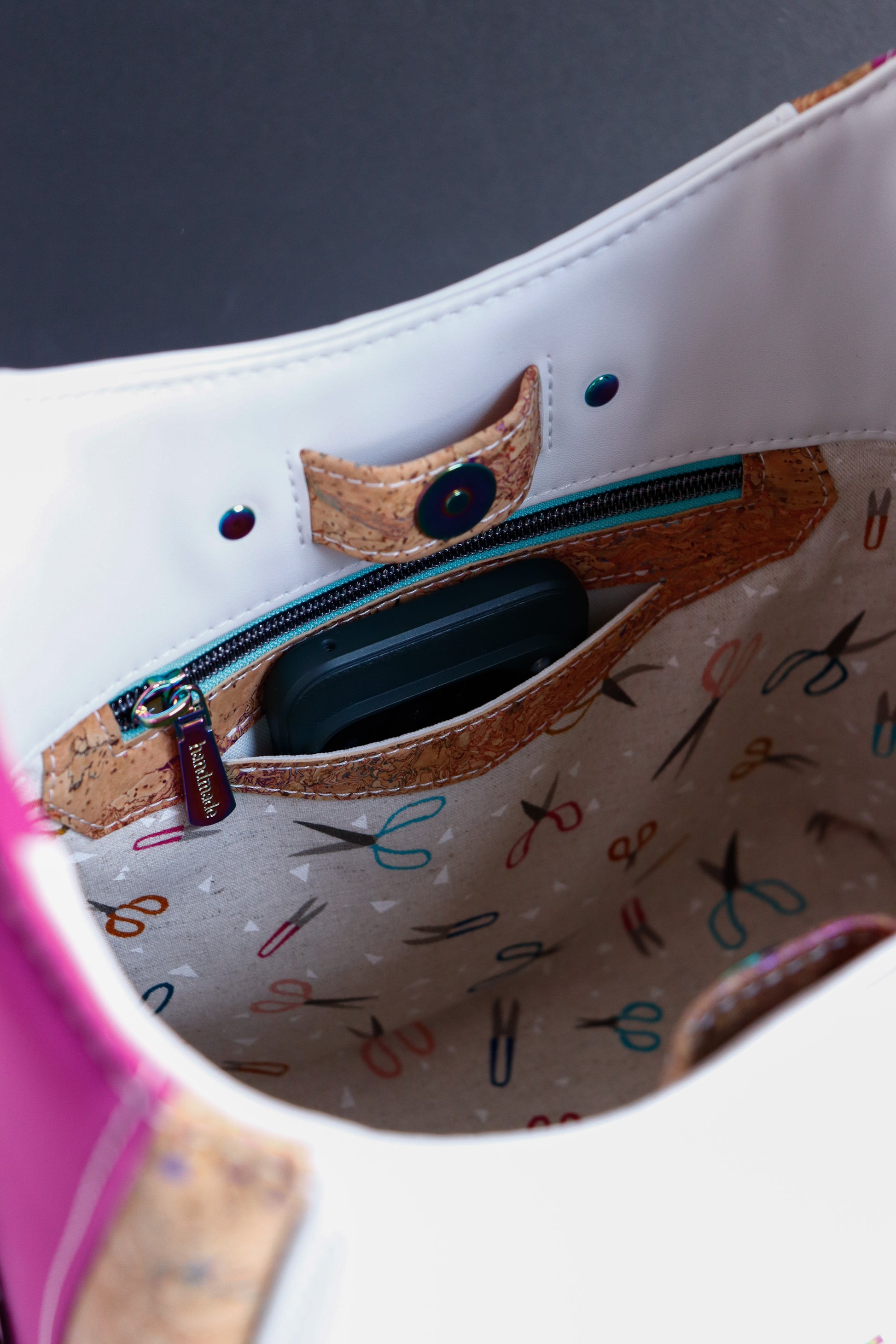 - Made with a combination of materials and textures - gorgeous cork with metallic rainbow swirls, magenta matte micro-fiber type material (so gorgeous and such a unique texture), and my favorite smooth cream vinyl. Lined with and woven material.