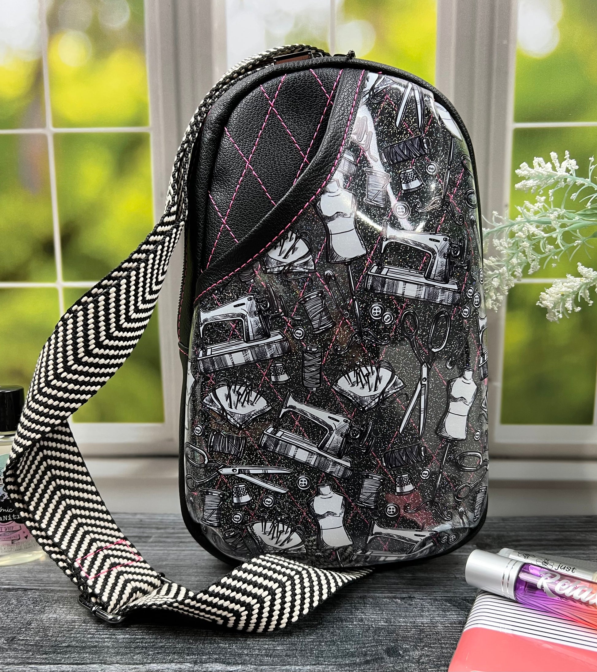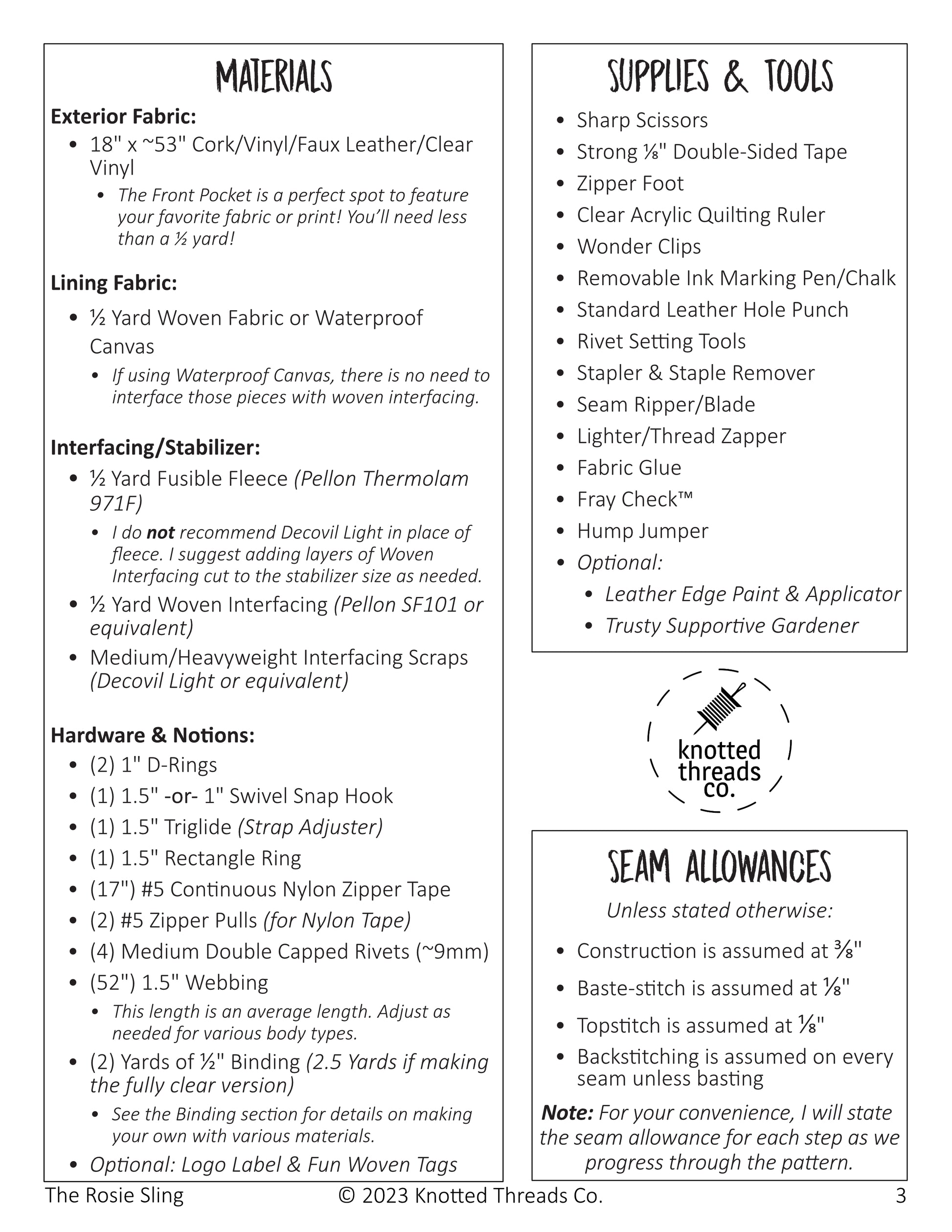 The Rosie Sling is an everyday sling with an elegant twist! A minimalist design that features a stylish three-dimensional exterior pocket, spacious interior, and an interior slip pocket. A wide strap offers comfort while the dual strap connector enables ambidextrous wear. Detailed instructions walk you through every step, including tips and tricks for successful binding and sewing with clear vinyl!