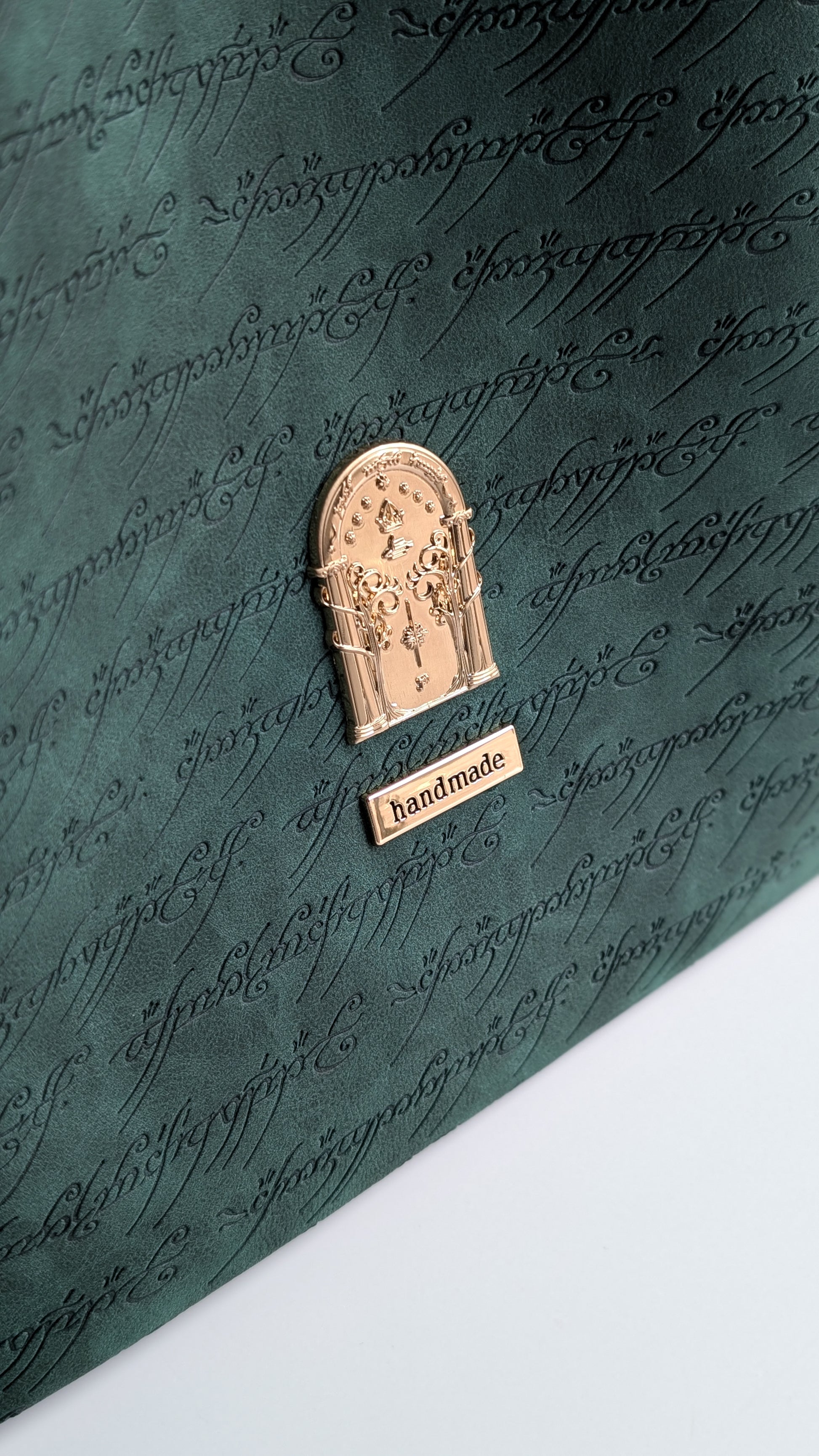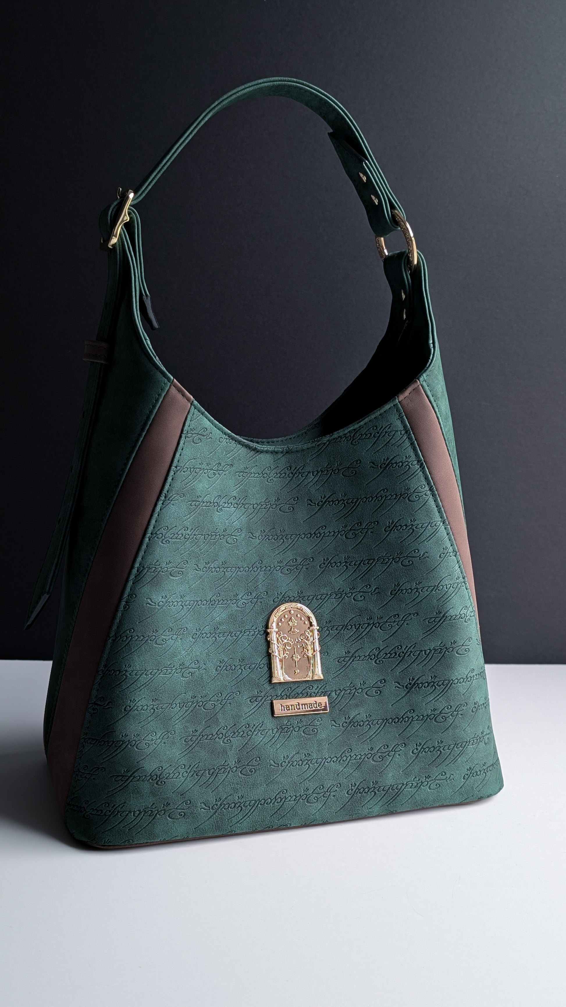 - Made with a combination of materials and textures - debossed forest green faux suede, a matching solid forest green faux suede, and a gorgeous chocolate faux suede. Lined with a water resistant material made from recycled plastic bottles.