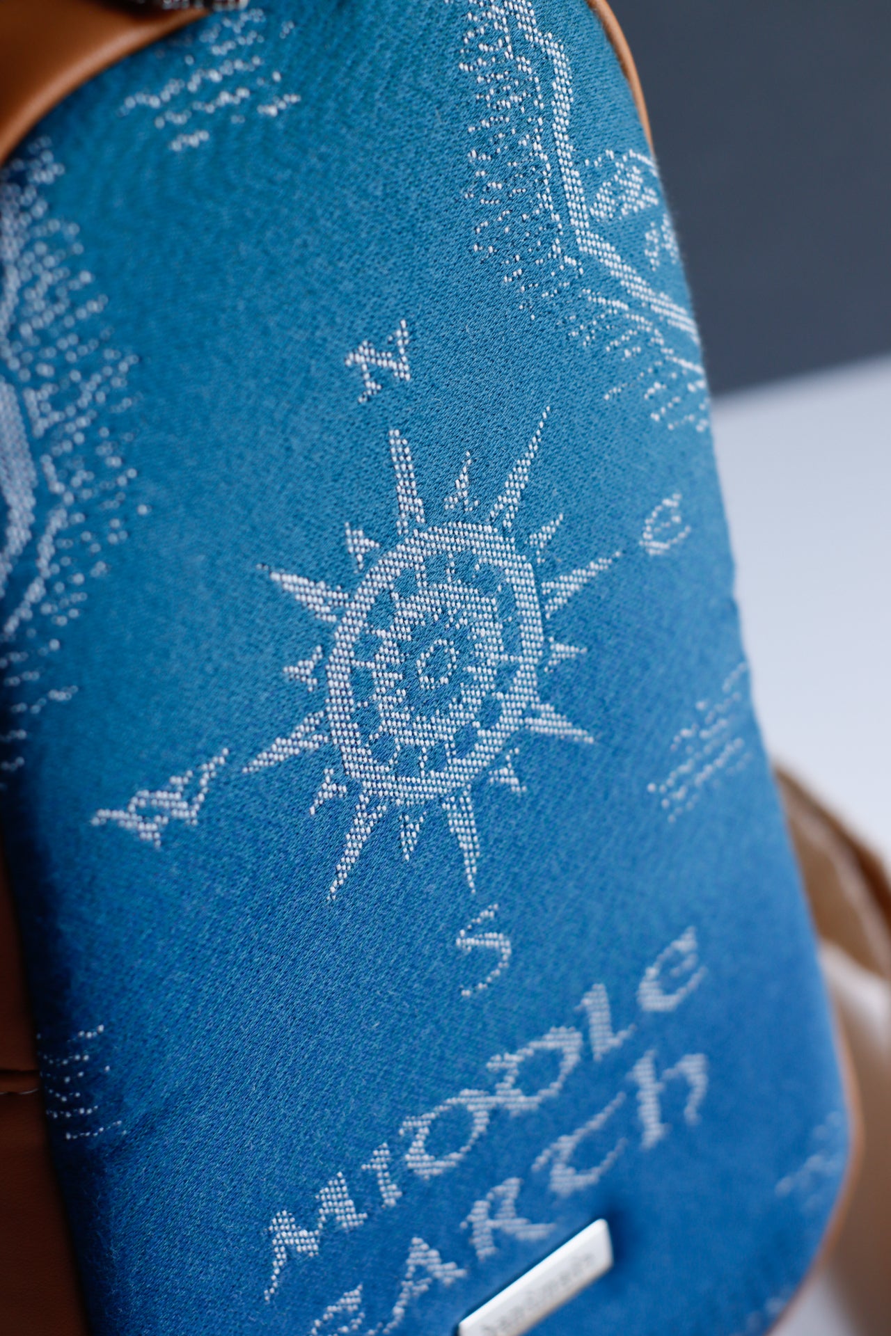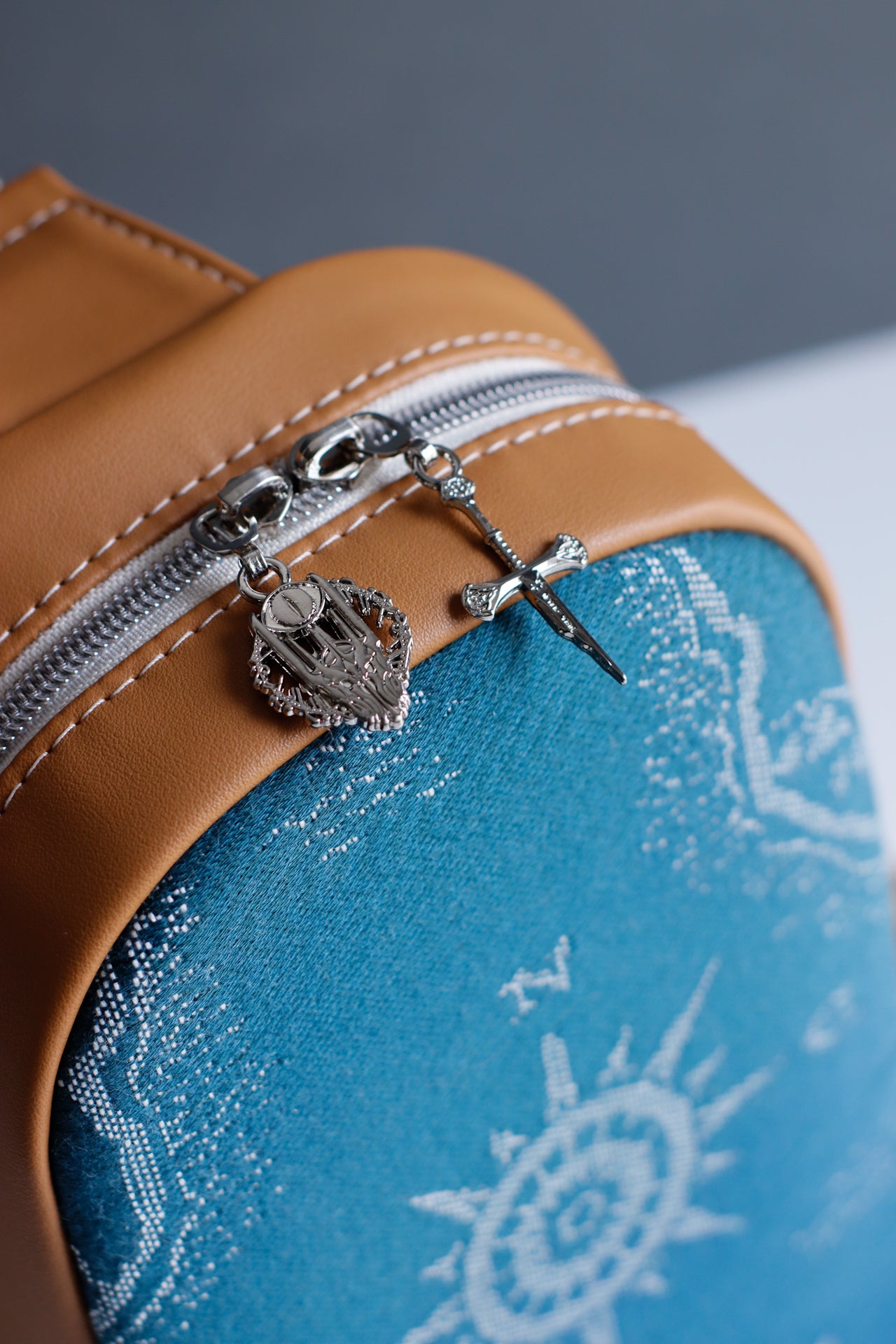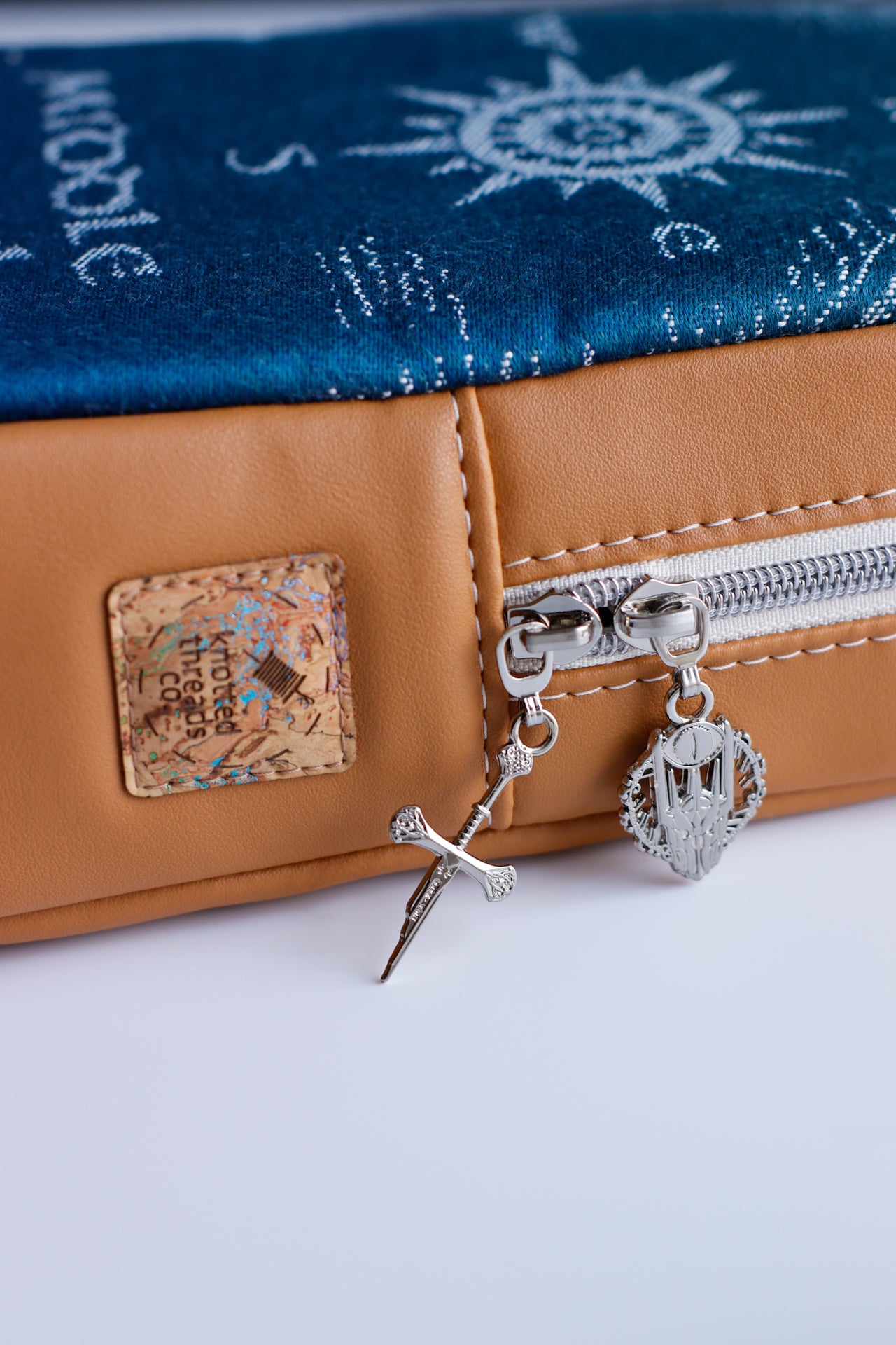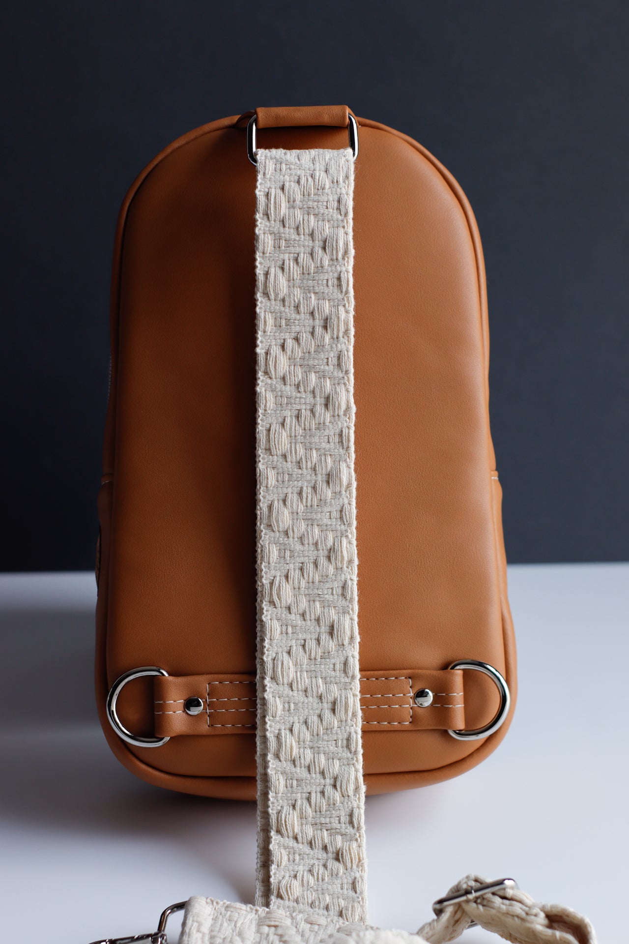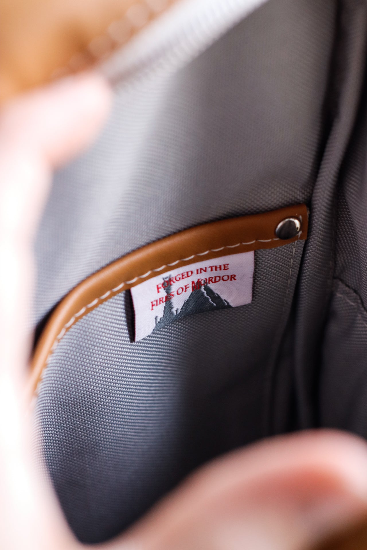 This minimalist-style sling features a wide, ambidextrous, approximately 50" adjustable strap. The exterior showcases officially licensed Middle-earth fabric from Oscha Slings, paired with soft, subtle camel-tan faux leather. Nickel hardware is used throughout, including limited-run themed zipper pulls. Inside, you’ll find a single slip pocket large enough to accommodate all phone types, along with a fun themed woven tag.